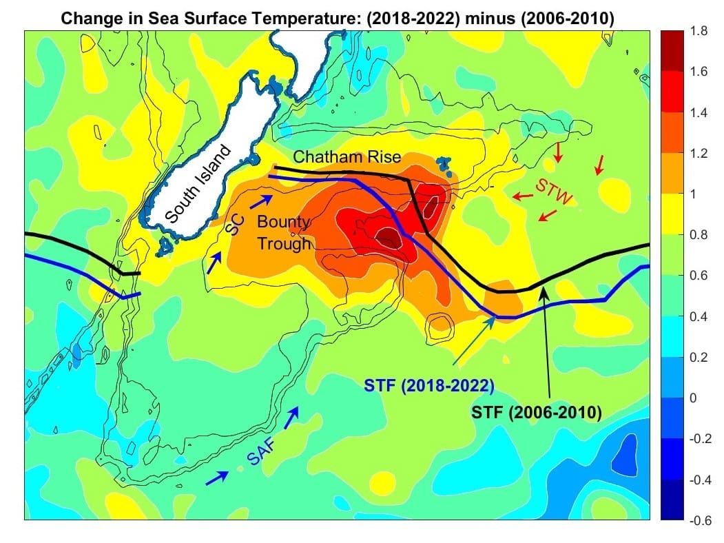 “However,” he said, “since 2006, an area south of Chatham Islands started warming and hasn’t stopped, and models predict this will continue until beyond 2100. This warming has resulted from the Subtropical Front moving to the west, a change observed in three different datasets that matches our modelling precisely – something that’s rare in oceanography,” said Dr. Sutton.
